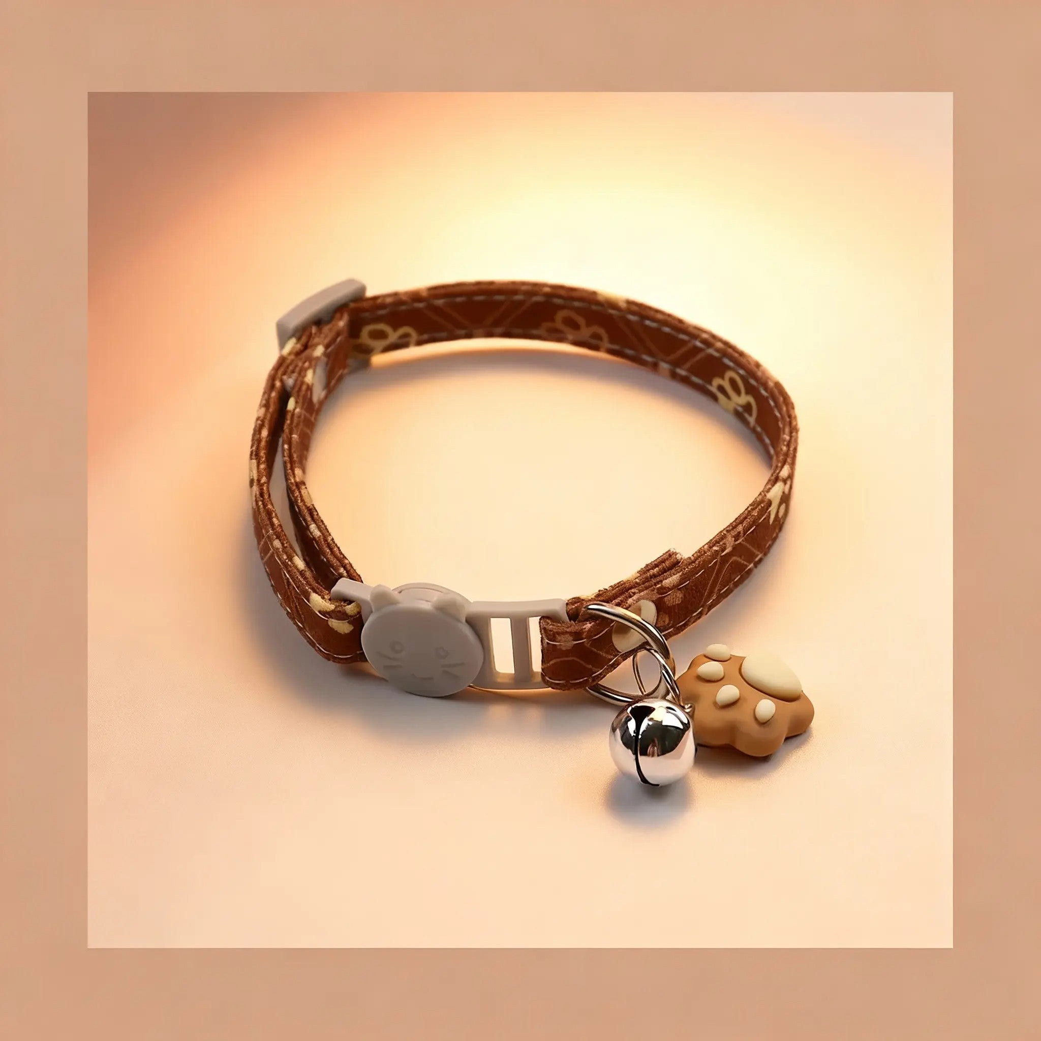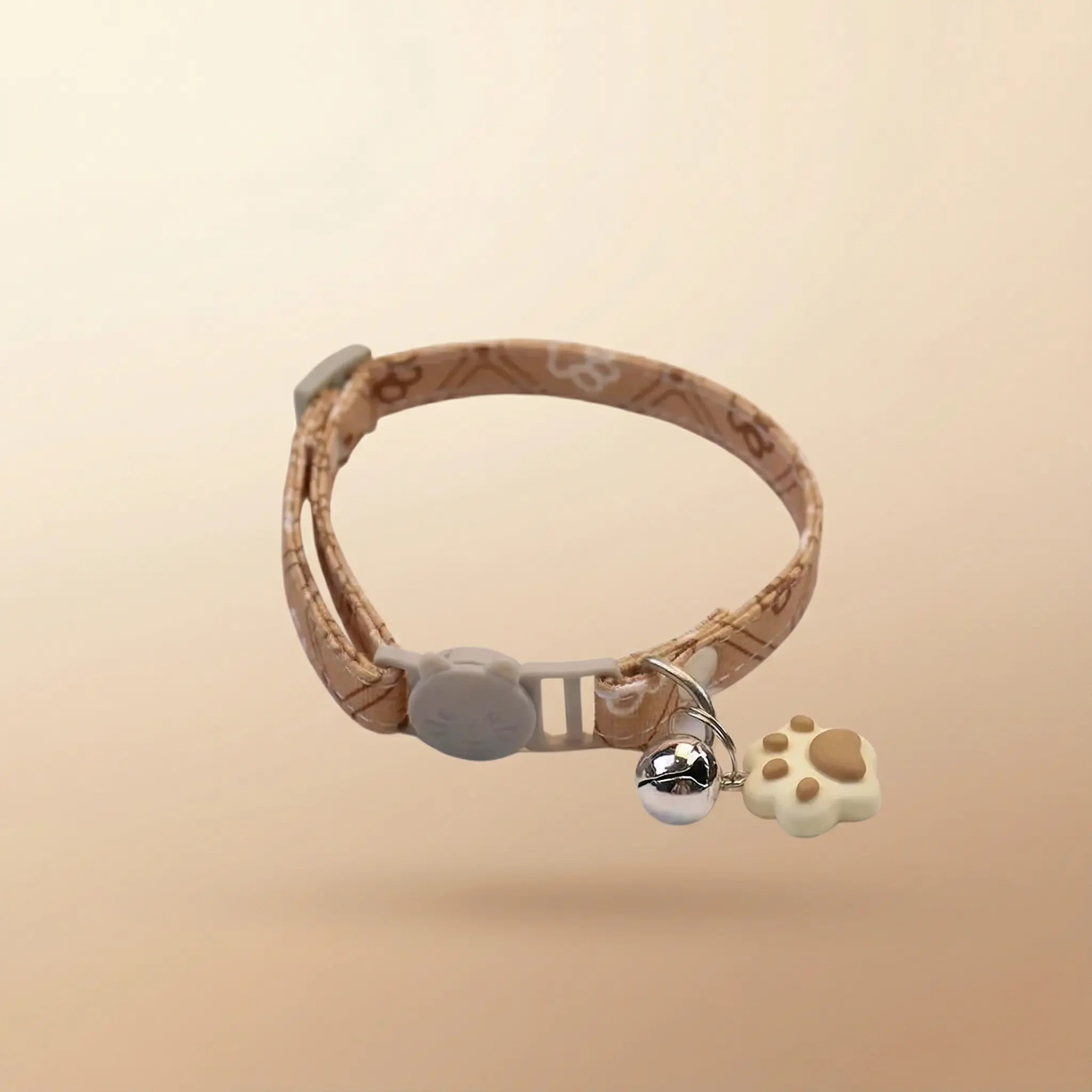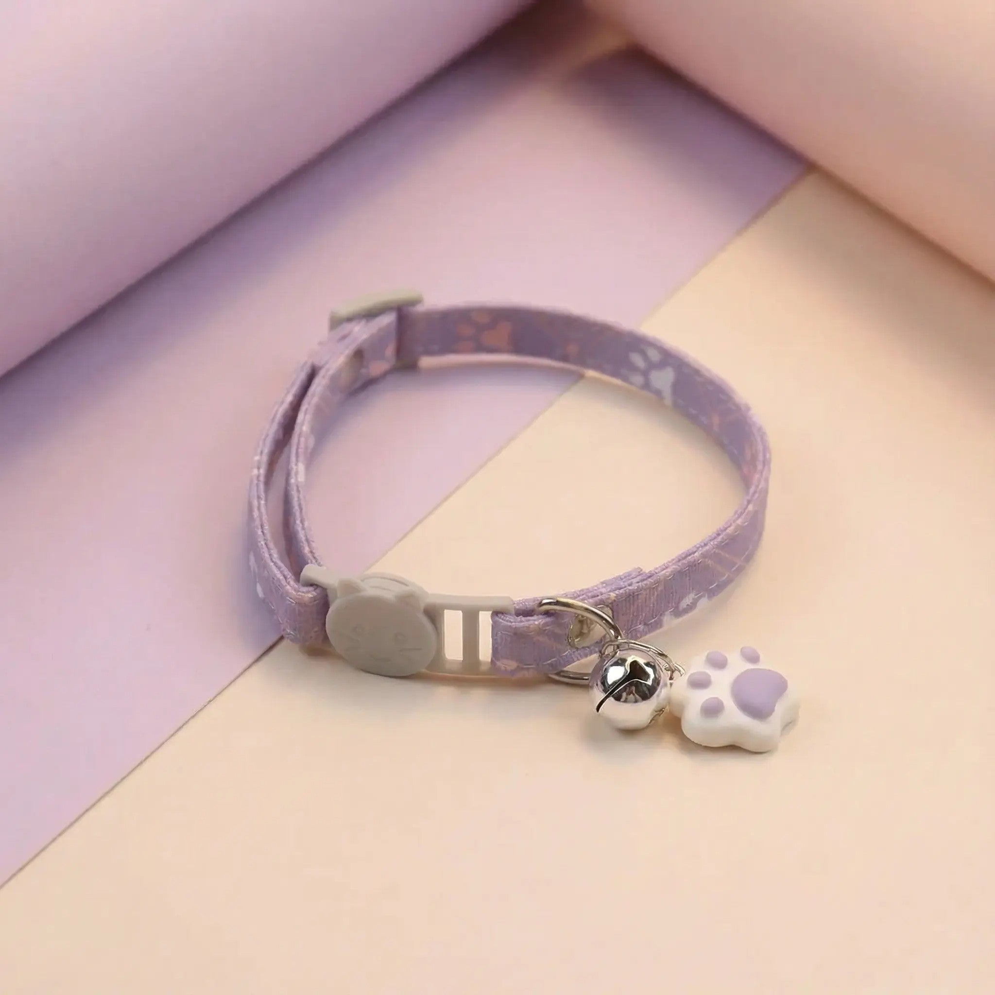 Collar para mascotas pequeñas (especialmente gatos) fabricado en mezcla poliéster/algodón, con patrón de huellas y un cascabel decorativo. Es ajustable (19–30 cm) y cuenta con cierre breakaway + quick release, pensado para facilitar el día a día y aumentar la seguridad.