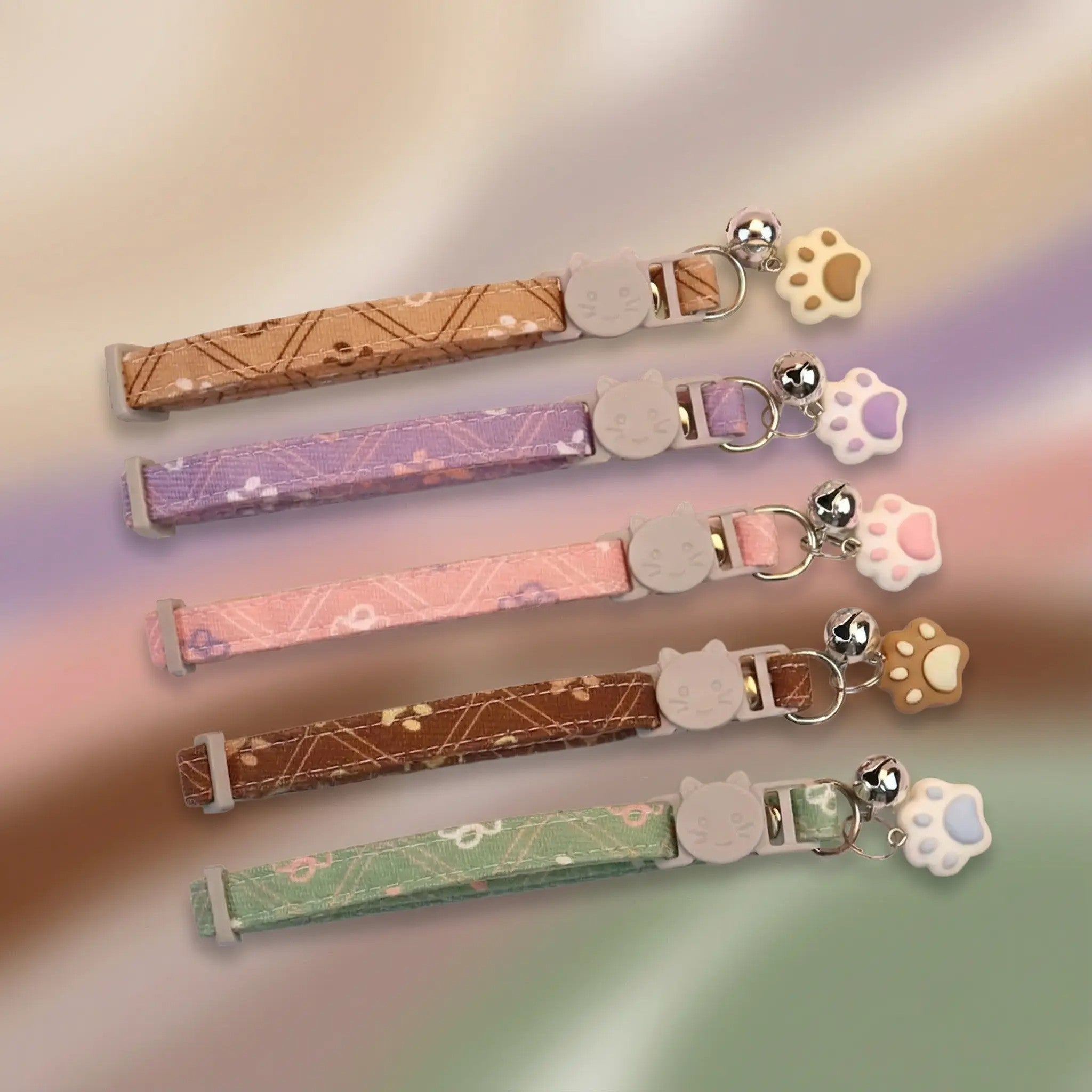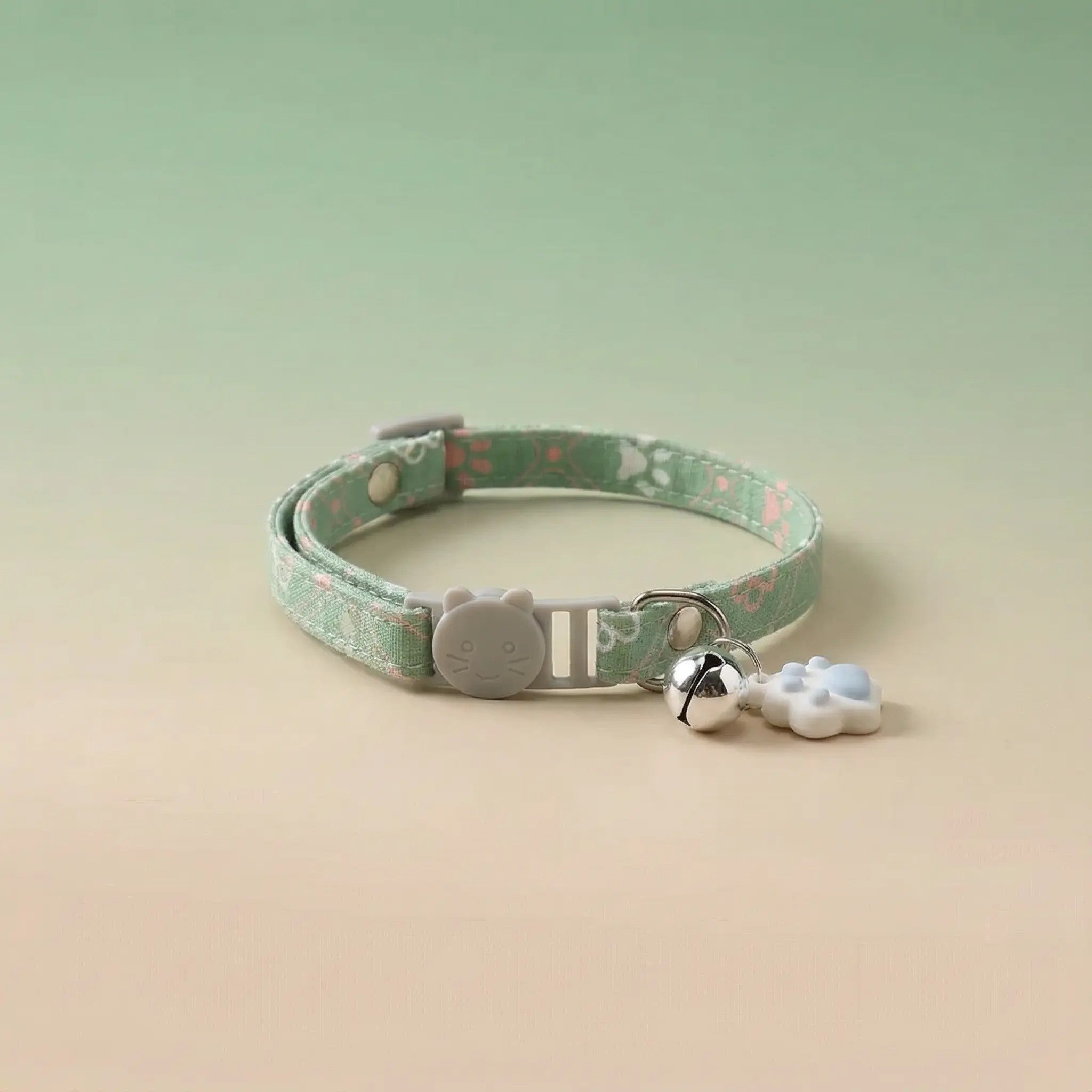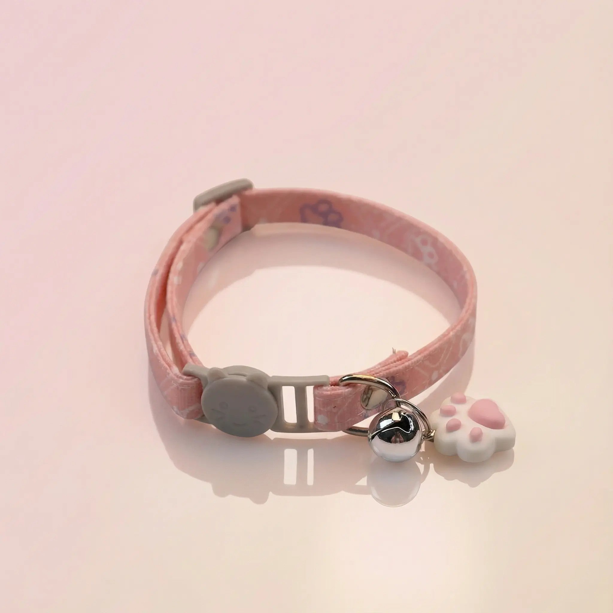 Collar para mascotas pequeñas (especialmente gatos) fabricado en mezcla poliéster/algodón, con patrón de huellas y un cascabel decorativo. Es ajustable (19–30 cm) y cuenta con cierre breakaway + quick release, pensado para facilitar el día a día y aumentar la seguridad.