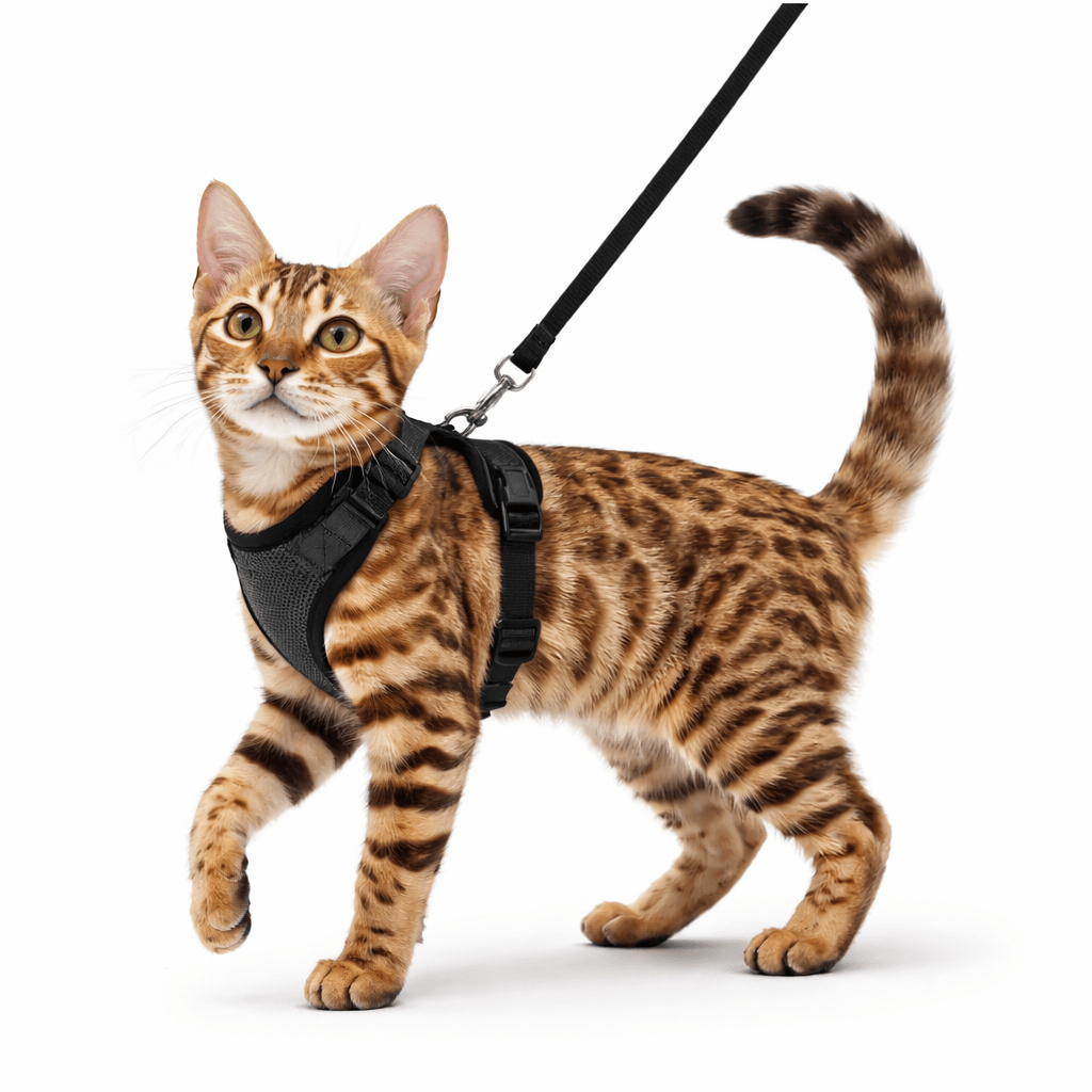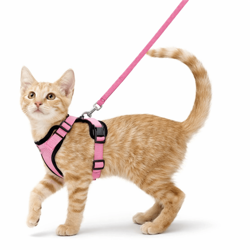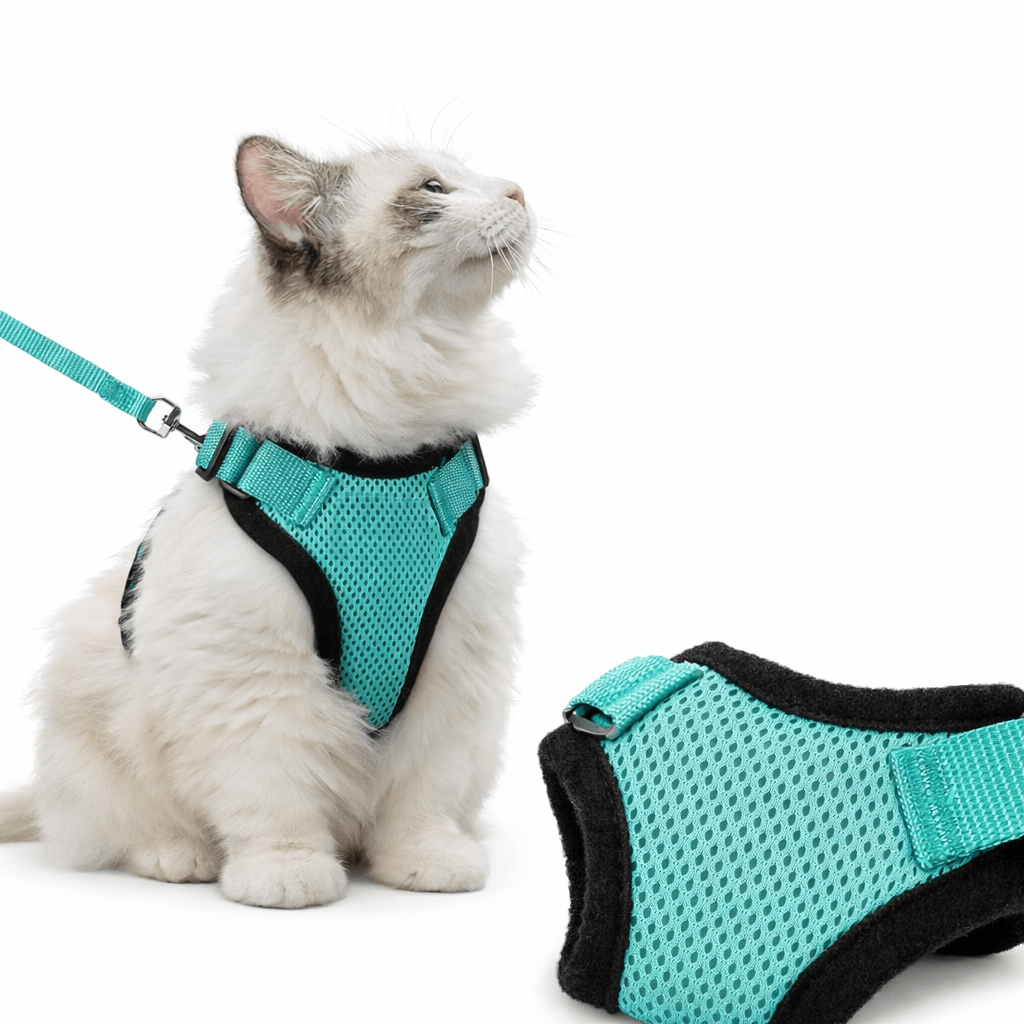 Arnés tipo chaleco suave y ajustable diseñado específicamente para gatos. Incluye correa a juego.
