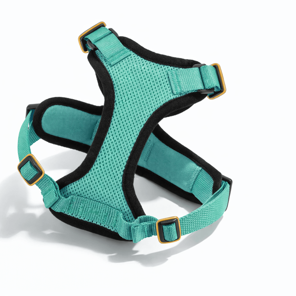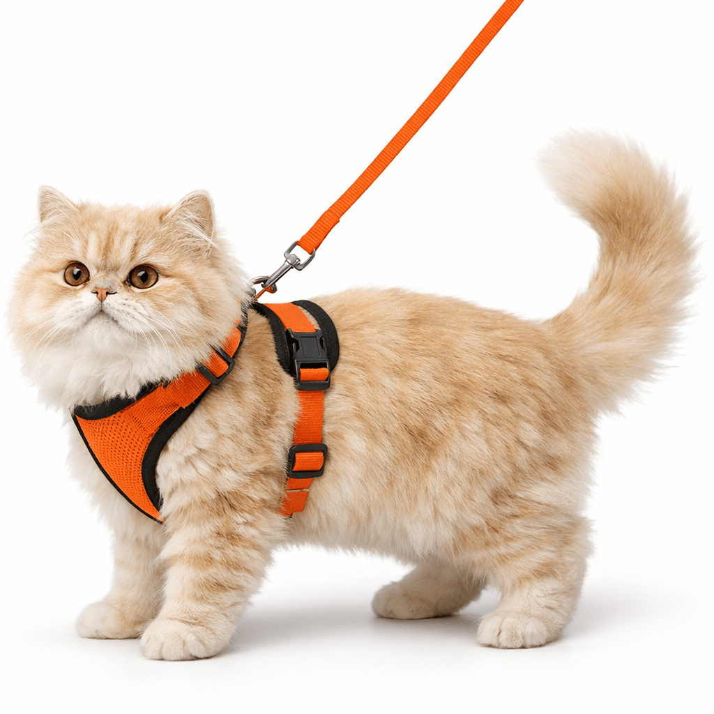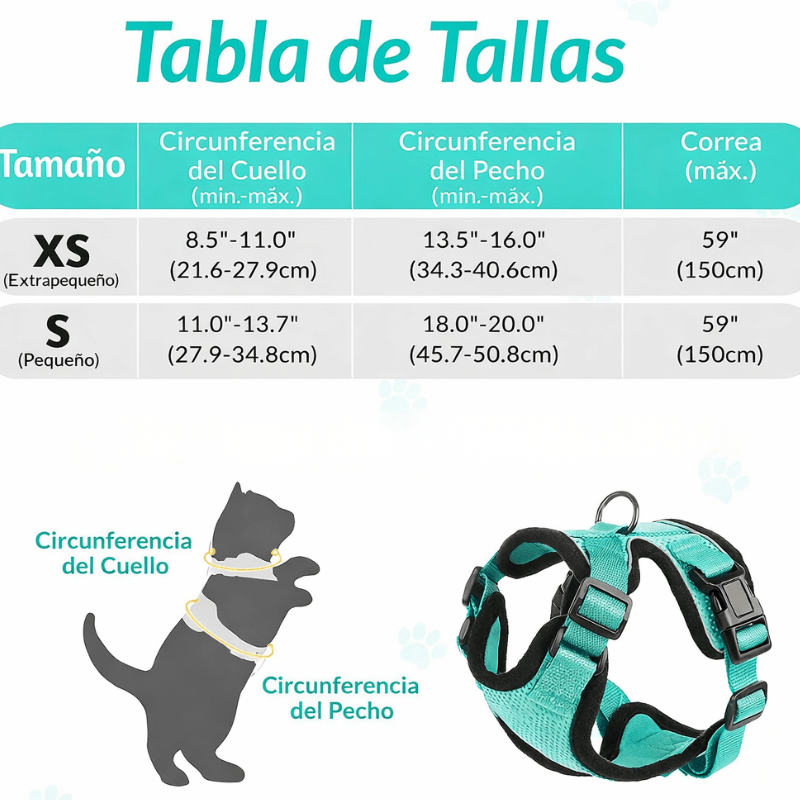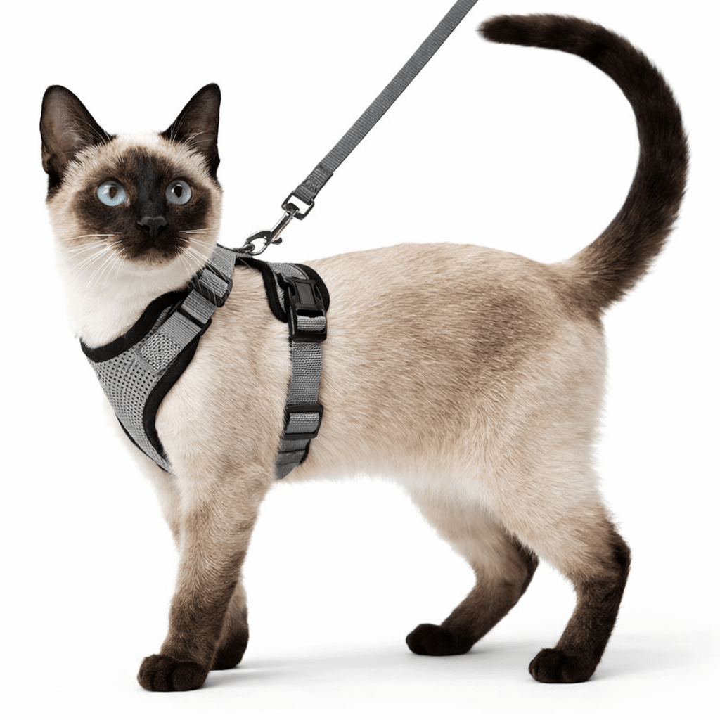 Arnés tipo chaleco suave y ajustable diseñado específicamente para gatos. Incluye correa a juego.